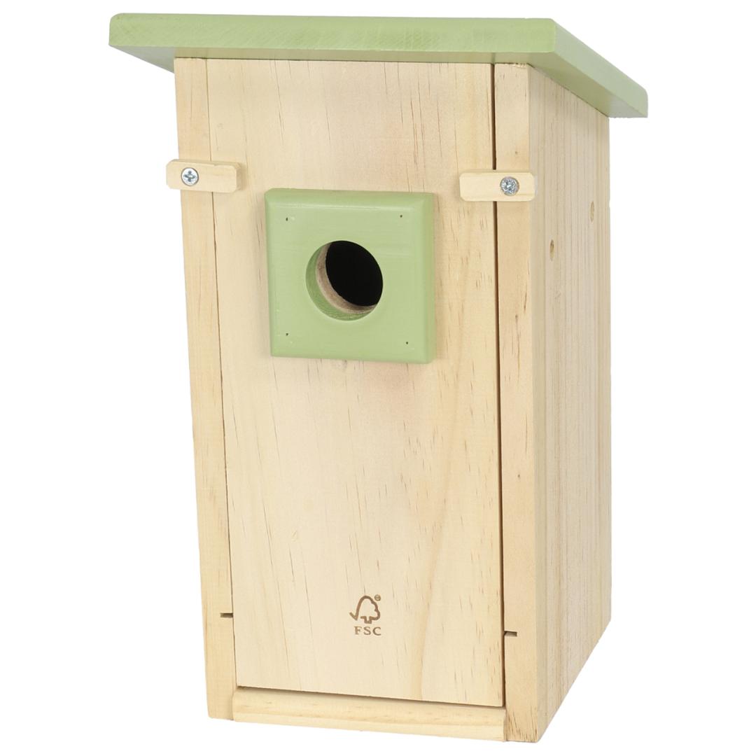 Deze nestkast is gemaakt van FSC hout waardoor deze nestkast ook een verantwoorde keuze is! De kast is bovendien voorzien van een stevig metalen ophangplaatje, waarmee je hem gemakkelijk en stabiel aan een schroef of haak bevestigt.