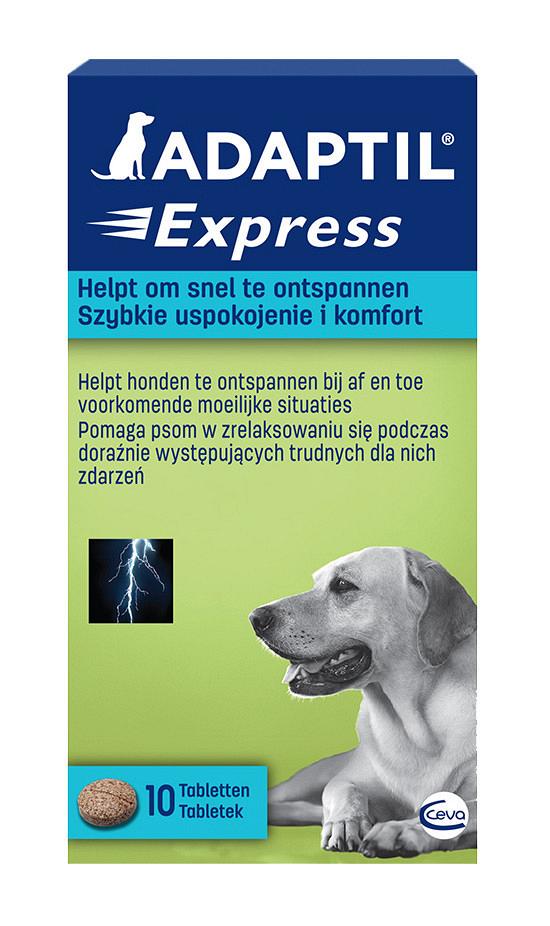 De Adaptil Express tabletten zijn ontwikkeld om snel te werken bij tijdelijke stressvolle situaties, zoals angst voor harde geluiden (bijv. vuurwerk). De Adaptil Express Tablet is een natuurlijk voedingssupplement. Het product werkt niet op basis van feromonen. De tabletten bevatten een unieke combinatie van aminozuren en vitamines die zorgen voor een snelle en tijdelijke kalmering om je hond te ontspannen. De tabletten werken NIET verdovend. De positieve werking van de natuurlijke, werkzame stoffen op het verminderen van angst is in vele wetenschappelijke en klinische studies bewezen.