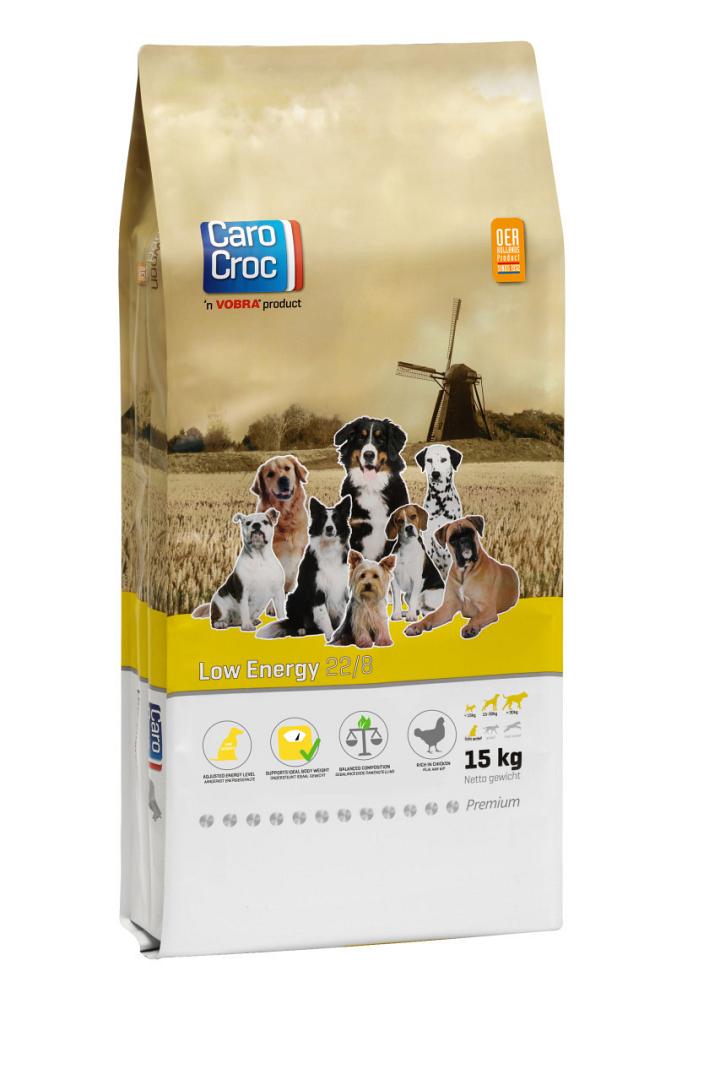 CaroCroc Low Energy is volledig voer voor volwassen honden met relatief weinig lichamelijke inspanning (wandelen en spelen) die neigen naar overgewicht (bijvoorbeeld Labrador en Golden Retriever) of gecastreerd/gesteriliseerd zijn.