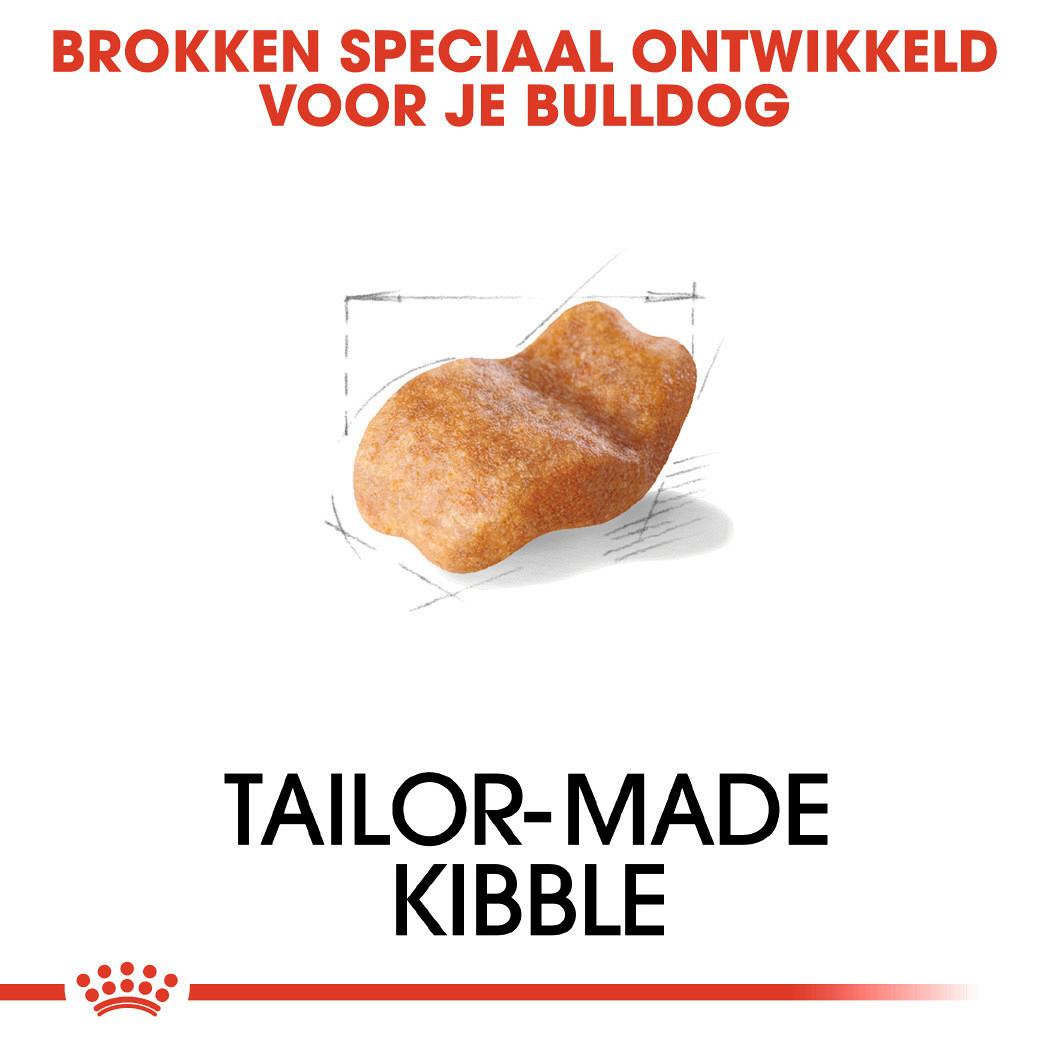 Het ras heeft een korte schedel en beschikt dan ook over de typische kenmerken daarvan. De kop is plat, hij heeft een omhoog gekrulde neus en een onderkaak langer dan de bovenkaak. Dit maakt het lastig voor hem om zijn eten in de bek te nemen en goed te kauwen. Speciaal daarvoor is Royal Canin Bulldog Adult ontwikkeld. Door een lage energiebehoefte is er risico op overgewicht en door de lichaamsbouw heeft de Engelse bulldog meer aanleg voor spijsverterings- en luchtwegproblemen.