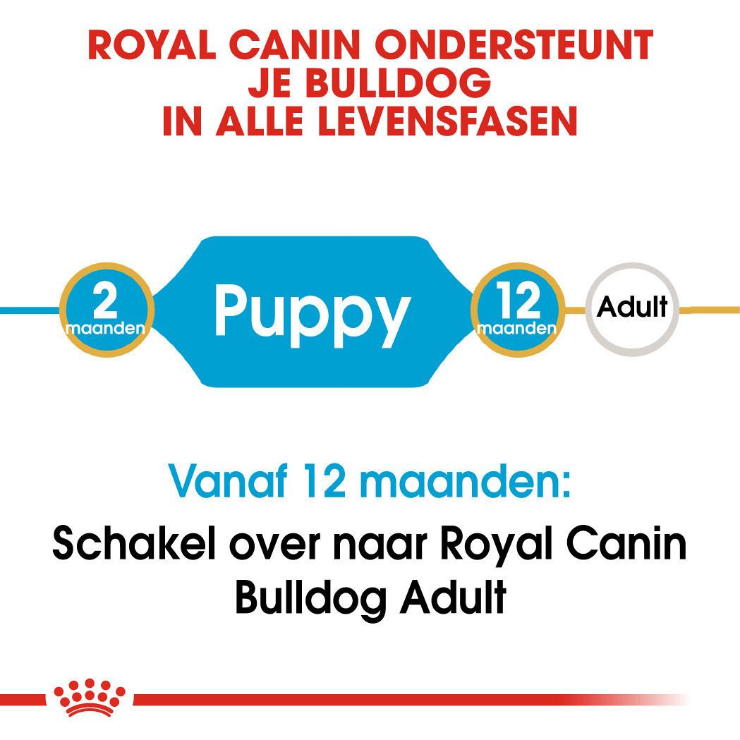 Royal Canin Bulldog Puppy is een rasspecifieke voeding speciaal afgestemd op de behoeften van Engelse bulldogpups tot 12 maanden oud.