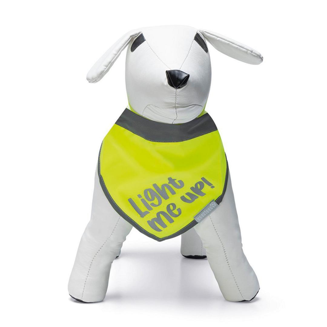 Met deze Beeztees reflecterende bandana Chiny, kan jij samen met jouw hond veilig op pad in het donker. Bandana Chiny, beschikt naast zijn felle gele kleur namelijk ook over reflecterende details. De reflecterende tekst, Light Me Up geeft de bandana een extra leuk effect. Hondenbandana Chiny is eenvoudig te bevestigen om de hals van jouw hond middels een klittenbandsluiting. Hondenbandana Chiny ziet er niet alleen leuk uit bij jouw hond, je bent er tevens zeker van dat jouw hond goed zichtbaar is in het donker. Is de bandana vies? Dan kan deze met een handwas schoongemaakt worden.