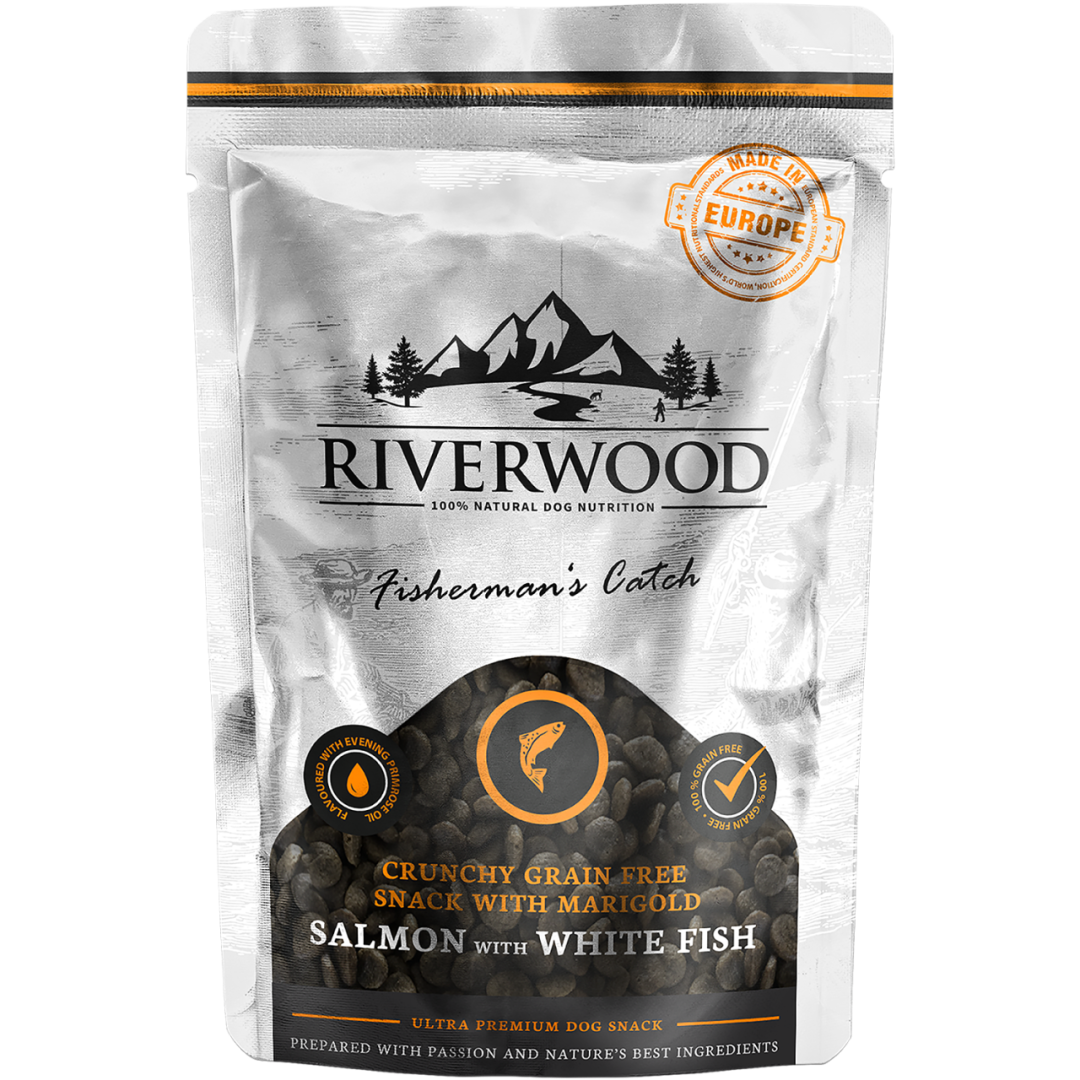 Riverwood Fishermans Catch Salmon & White Fish is een natuurlijke, krokante, graanvrije hondensnack op basis van zalm en witvis en is geschikt voor volwassen honden van alle rassen.