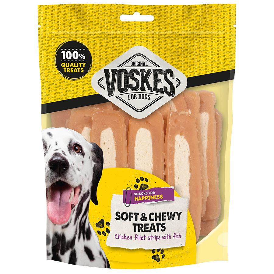 Voskes Kipfilet Strips met Vis is een smakelijke kip met Vis traktatie voor jouw hond , geschikt als tussendoortje en is een aanvulling op de dagelijkse voeding