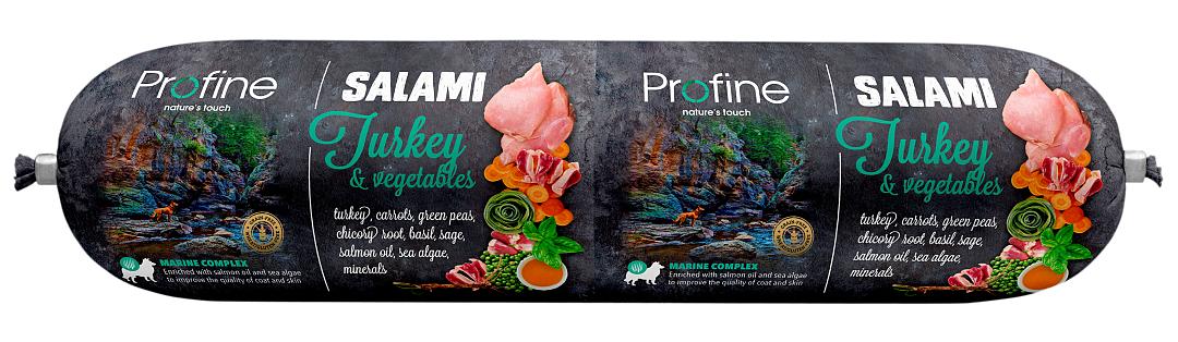De Profine SALAMI met kalkoen en groenten is een 100% natuurlijke en graanvrije vleesworst en geschikt als volledige voeding voor volwassen honden.