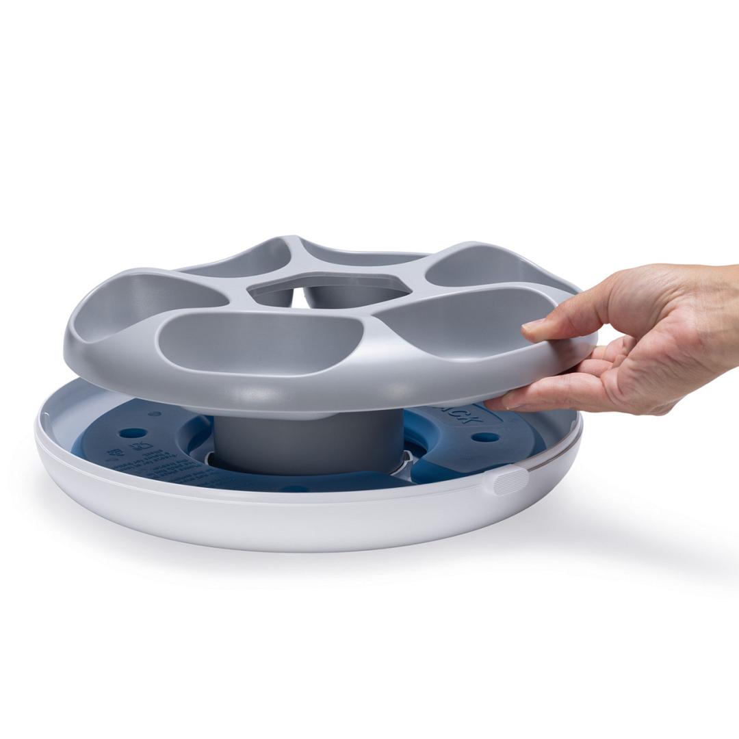 Beeztees automatische voerbak Onni is de ideale automatische voerbak voor katten en kleine honden. Met een capaciteit van 6 bakjes van 180 ml biedt deze voerautomaat ruimte tot 6 maaltijden per dag. Deze voerautomaat is ontworpen voor zowel nat- als droogvoer. Het wordt geleverd met 2 uitneembare koelelementen die in de vriezer kunnen worden geplaatst en het voer tot wel 24 uur vers houden. De voerautomaat is ontworpen voor eenvoudig onderhoud 90% van de onderdelen zijn demonteerbaar en kunnen in de vaatwasser worden gereinigd, met uitzondering van de hoofdunit. De voerbak werkt op een USB-oplaadbare 3600 mAh lithiumbatterij, die na 6-8 uur opladen tot 30 dagen meegaat. Een handige oplaadindicator waarschuwt je wanneer de batterij bijna leeg is.