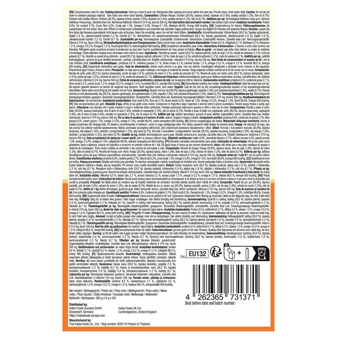 Inaba Churu is gemaakt met lekkere ingrediënten van hoge kwaliteit, waaronder gekweekte kip en/of natuurlijke wildgevangen tonijn. Elke heerlijke, romige Churu tube bevat 88% vocht en slechts zes calorieën (een tiende van de calorieën van traditionele droge kattensnoepjes), waardoor het een snack is die je met een goed gevoel kunt voeren.