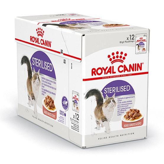 Royal Canin Sterilised in gravy zijn maaltijdzakjes met vleesbrokjes in saus voor gesteriliseerde/gecastreerde katten van 1 tot 7 jaar.