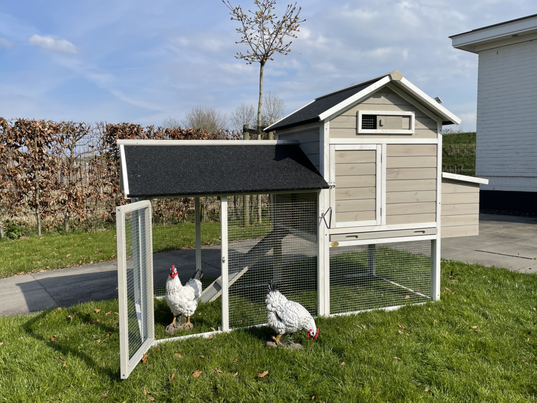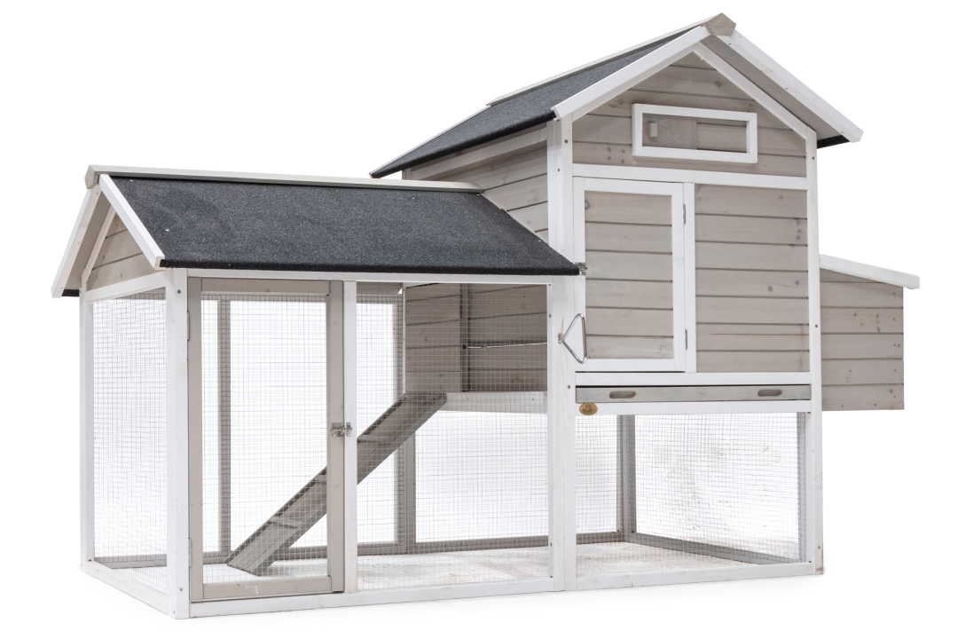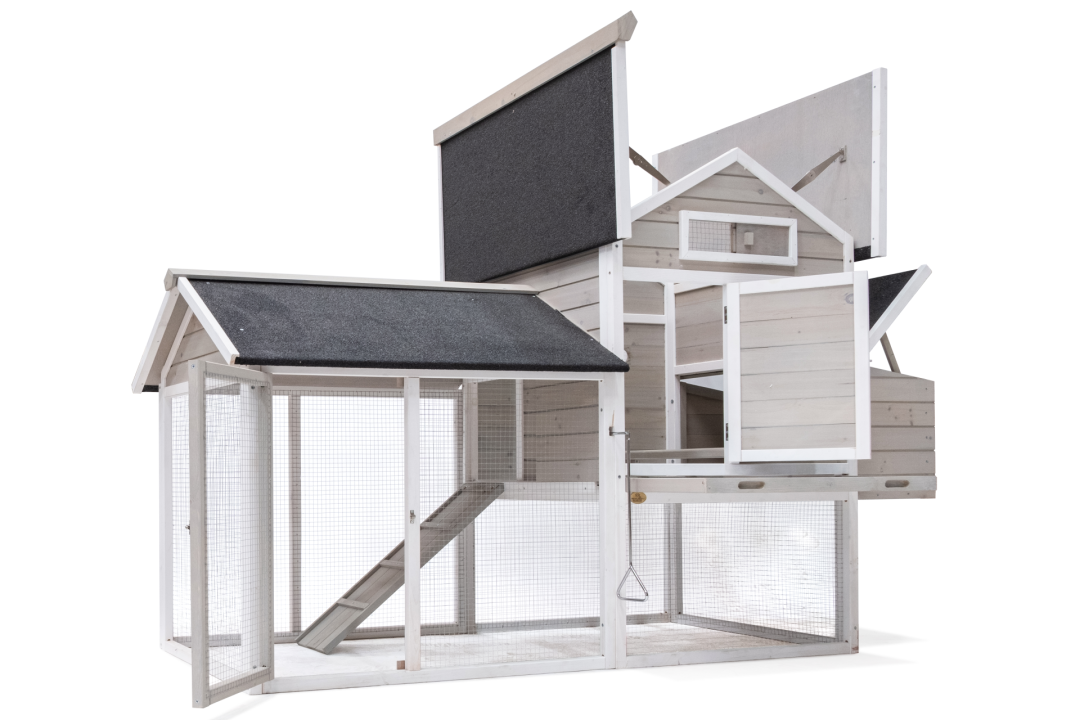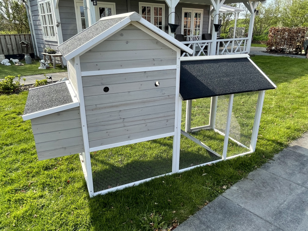 Het konijnenhok Serama is een stijlvol en duurzaam buitenverblijf in grijs/wit, geschikt voor 1 groot of 2 kleine konijnen. Ook geschikt voor 3 of 4 kippen.