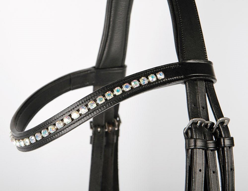 De luxe, brede aansnoerneusriem is 4,5 cm breed (incl. zwarte padding) en is anatomisch gevormd rond het bit. Met speciaal, anatomisch, zacht onderlegd kopstuk. Elegante smalle riempjes voor onder andere de keelriem. Uitgevoerd met luxe, hangende frontriem met lak en schitterende AB-kristallen. Blinde sluitingen aan bakstukken en teugels.