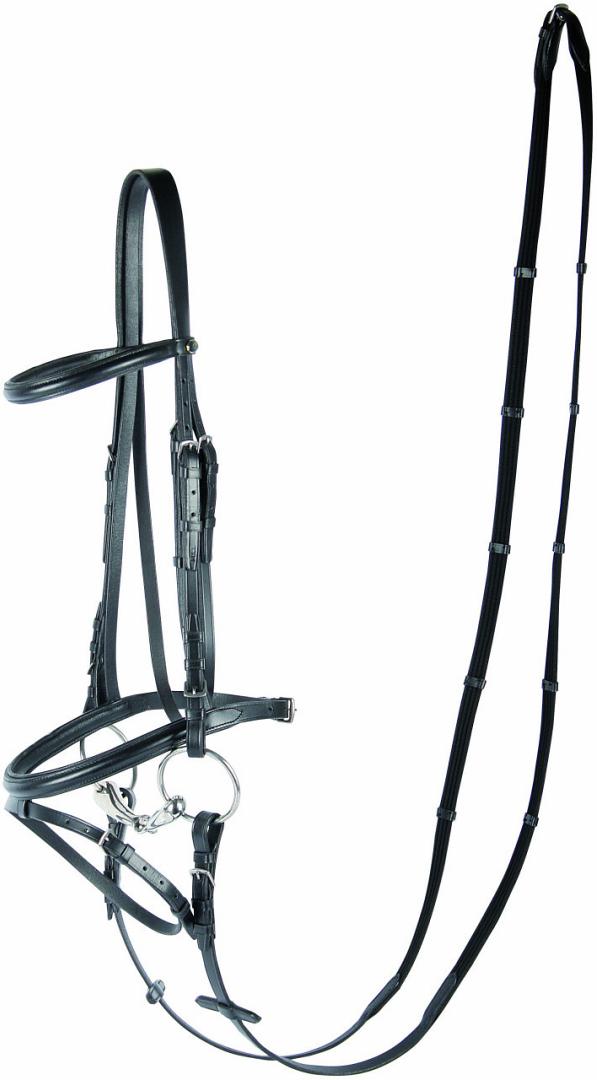 Het Harry's Horse Bronze hoofdstel is een lederen hoofdstel met gecombineerde neusriem met zwarte padding, RVS gespen en webband teugels met stops.
