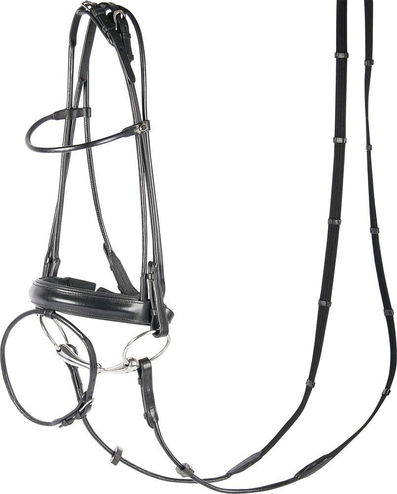 Rondgenaaid hoofdstel van hoogwaardig leder. Met aansnoerneusriem (4 cm), zachte padding en blinde sluitingen. Incl. webband teugels.