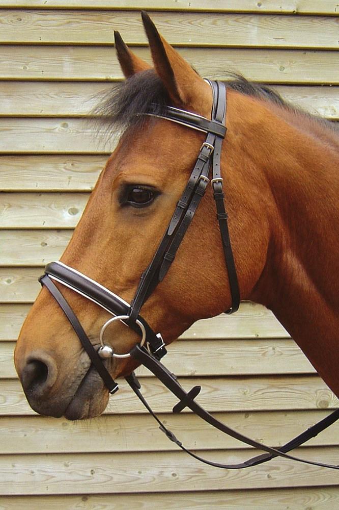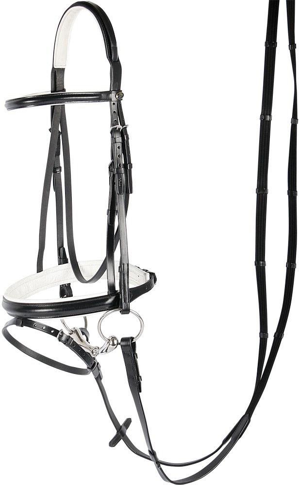 Leder hoofdstel met gecombineerde neusriem, compleet met webband teugels, onderlegd kopstuk, neusriem en frontriem de bakstukken van de neusriem lopen over en door het kopstuk.
